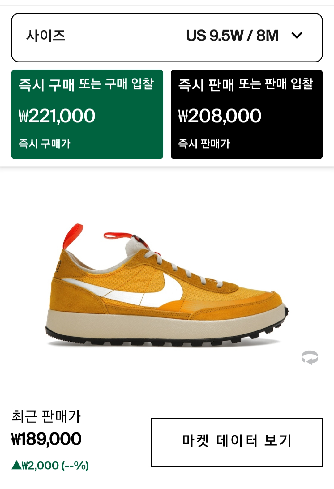 먼저, 즉시 구매 시 221,000원 / 즉시 판매 시 208,000원 입니다.